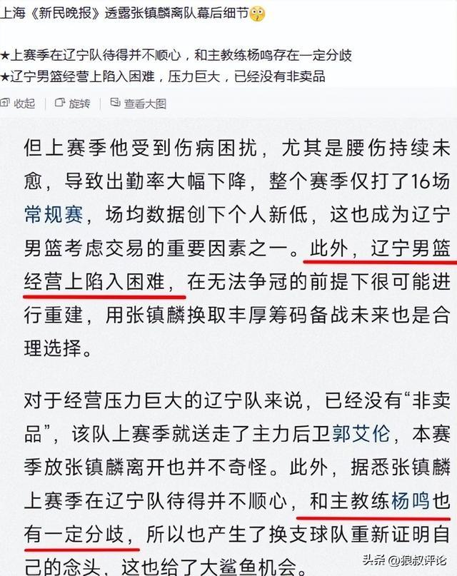 对于经营压力巨大的辽宁队来说,已经没有“非卖品”,该队上赛季就送走了主力后卫郭艾伦,本赛季放张镇麟离开也并不奇怪。