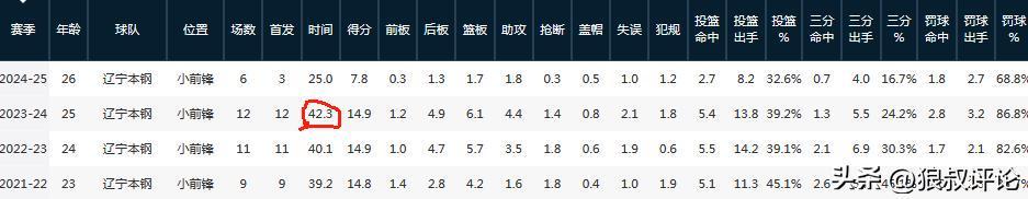 季后赛更是很难进入到“轮休”阵容,张镇麟在辽宁男篮三连冠时期的季后赛,除了21-22赛季的首冠平均出场时间为39.2分钟外,剩下2个冠军平均出场时间都超过了40分钟,其中23-24赛季达到了场均42.3分钟刷新高。
