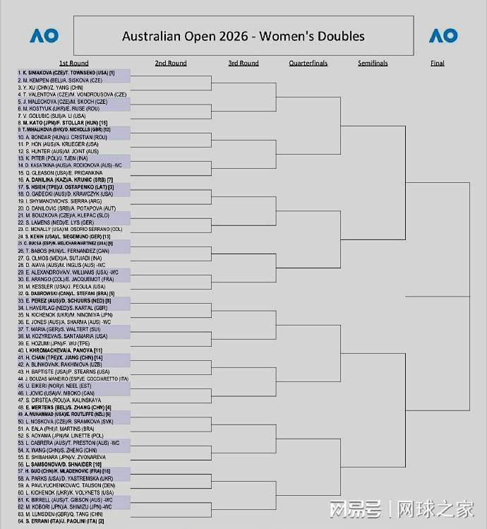 另外,北京时间昨天,2026澳网公布了男双和女双的签表。中国军团有14人组对参赛,其中,男双的商竣程/张之臻vs 埃伯登/拉姆;女双的徐一璠/杨钊煊 vs 瓦伦托娃/万卓索娃、蒋欣玗/詹皓晴 vs 布林科娃/拉克西莫娃、张帅/梅尔滕斯 vs 科斯蒂亚/卡林斯卡娅、王欣瑜/郑赛赛 vs卡布雷拉/普雷斯顿、郭涵煜/穆拉德诺维奇 vs 帕克斯/雅斯特雷姆斯卡、汤千慧/拉姆斯登 vs 埃拉尼/鲍里妮。另外,谢淑薇和吴芳娴也将分别与奥斯塔彭科和穗积惠理组对出战。